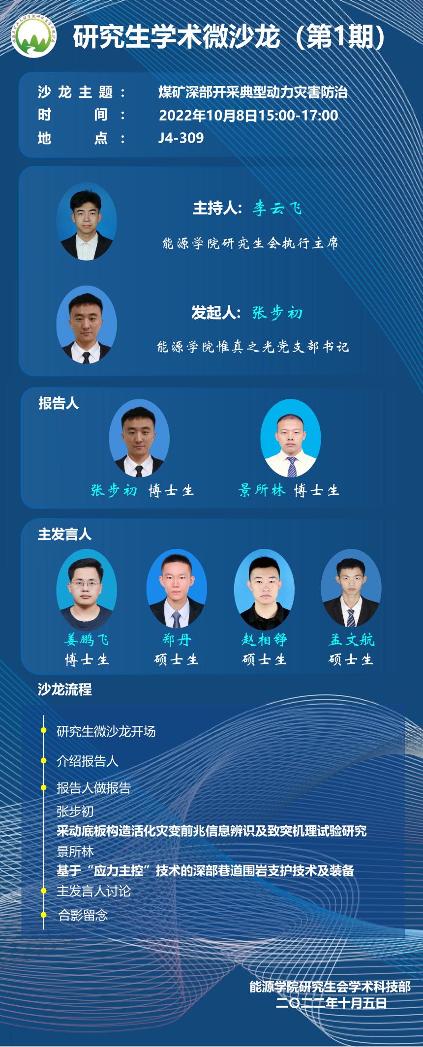 10月8日,由色情小说 主办,色情小说 研究生会承办的第1期研究生学术微沙龙“煤矿深部开采典型动力灾害防治”在J4-309成功举办。本次学术微沙龙活动邀请惟真之光党支部书记张步初、博士生景所林做主题报告,色情小说 研究相关方向的博士生和硕士生参加,活动由研究生会执行主席李云飞主持。