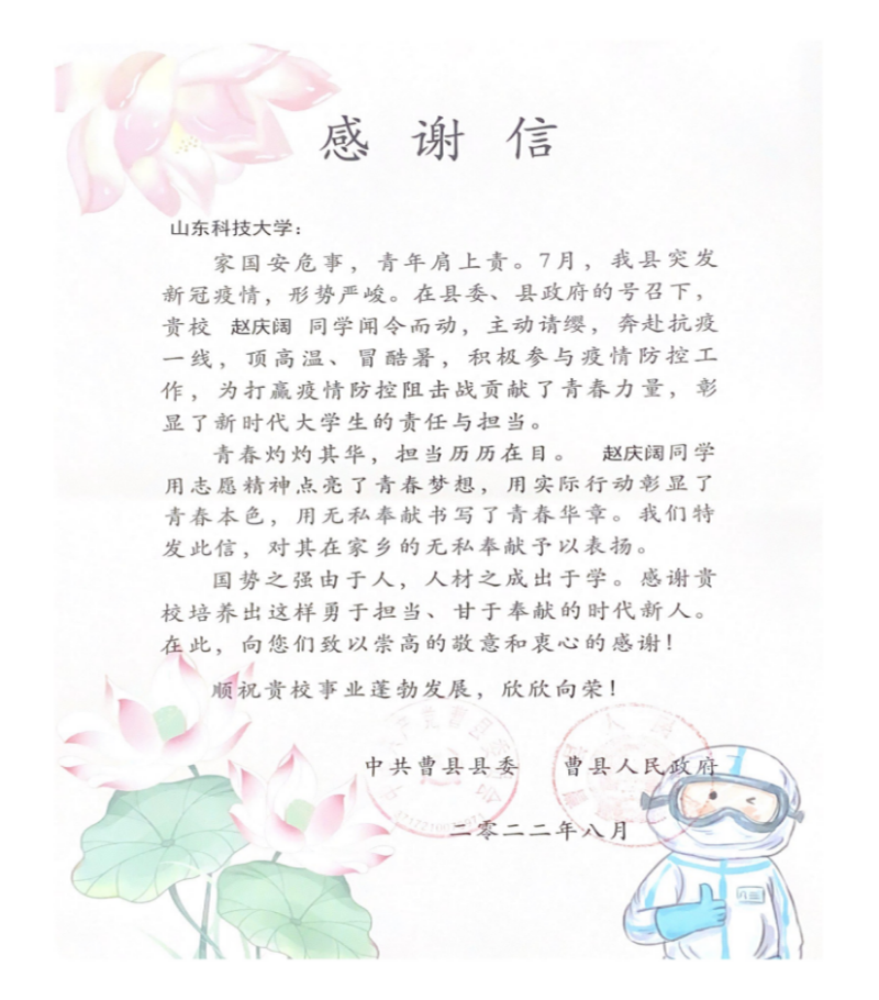 近日,色情小说 收到中共曹县县委、曹县人民政府和山东省河口管理局寄来的感谢信,分别对色情小说 赵庆阔在当地抗疫志愿服务工作和色情小说 色情小说 精益求精团队暑假期间社会实践活动的突出贡献、积极态度提出了表扬,并对色情小说 的教育工作予以肯定和感谢。
