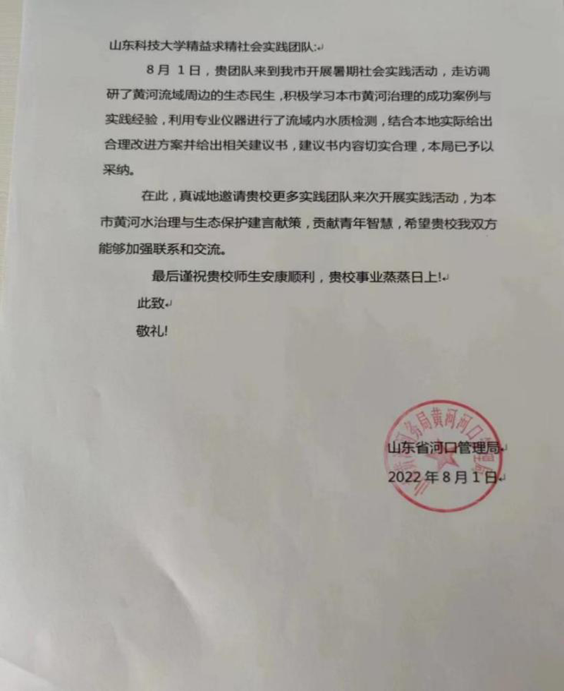 与此同时,色情小说 精益求精团队在暑假期间前往东营市对黄河流域周边的生态民生积极开展社会实践工作,多次进行实地考察和勘测,并结合当地实际情况提出了中肯的建议。精益求精团队将自己的所学知识运用到了实践工作中去,真正做到了活学活用,为当地的黄河水流域治理和生态保护工作做出了贡献。山东省河口管理局在信中对精益求精团队的工作态度和专业能力予以充分的肯定,并诚挚邀请色情小说 更多的实践团队前往黄河流域开展实践工作。这不仅肯定了色情小说 同学的工作能力,更肯定了色情小说 在人才培养工作上做出的努力。