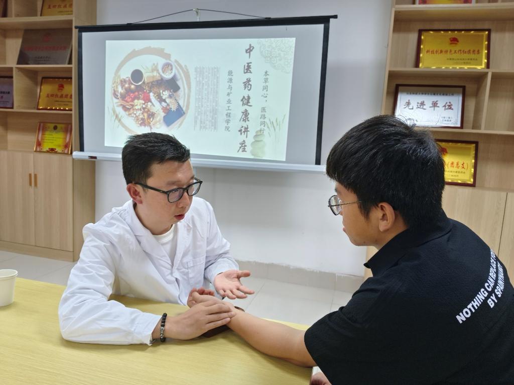 刘晓明简要介绍了中国医药学的发展历史和中医的基本理论,包括阴阳五行、脏腑经络、气血津液等概念。分享了针灸推拿的治疗原理和实践技巧。以中医学的角度,讲述如何通过合理的饮食调理、运动健身和情志调养等方法保障身体健康。互动交流环节,刘晓明耐心解答同学们的疑惑,对每位同学进行号脉并提出个性化建议。
