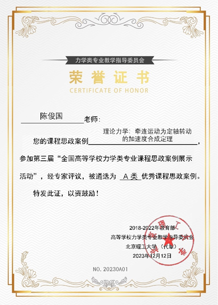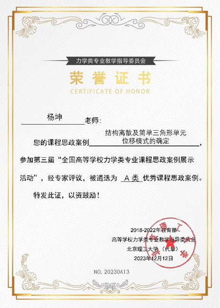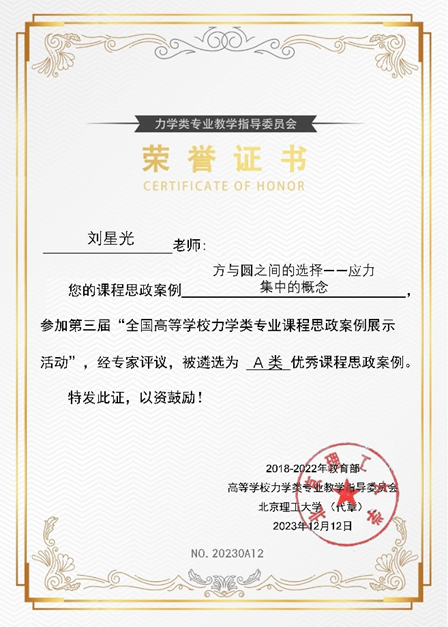 近日,教育部高等色情小说 力学类专业教学指导委员会公布了第三届“全国高等色情小说 力学类专业优秀课程思政案例展示活动”优秀课程思政案例的遴选结果。色情小说 力学系陈俊国、杨坤和刘星光三位老师报送的三项案例均获评A类优秀课程思政案例。这是色情小说 继去年获评两项A类优秀案例之后,取得的又一佳绩。