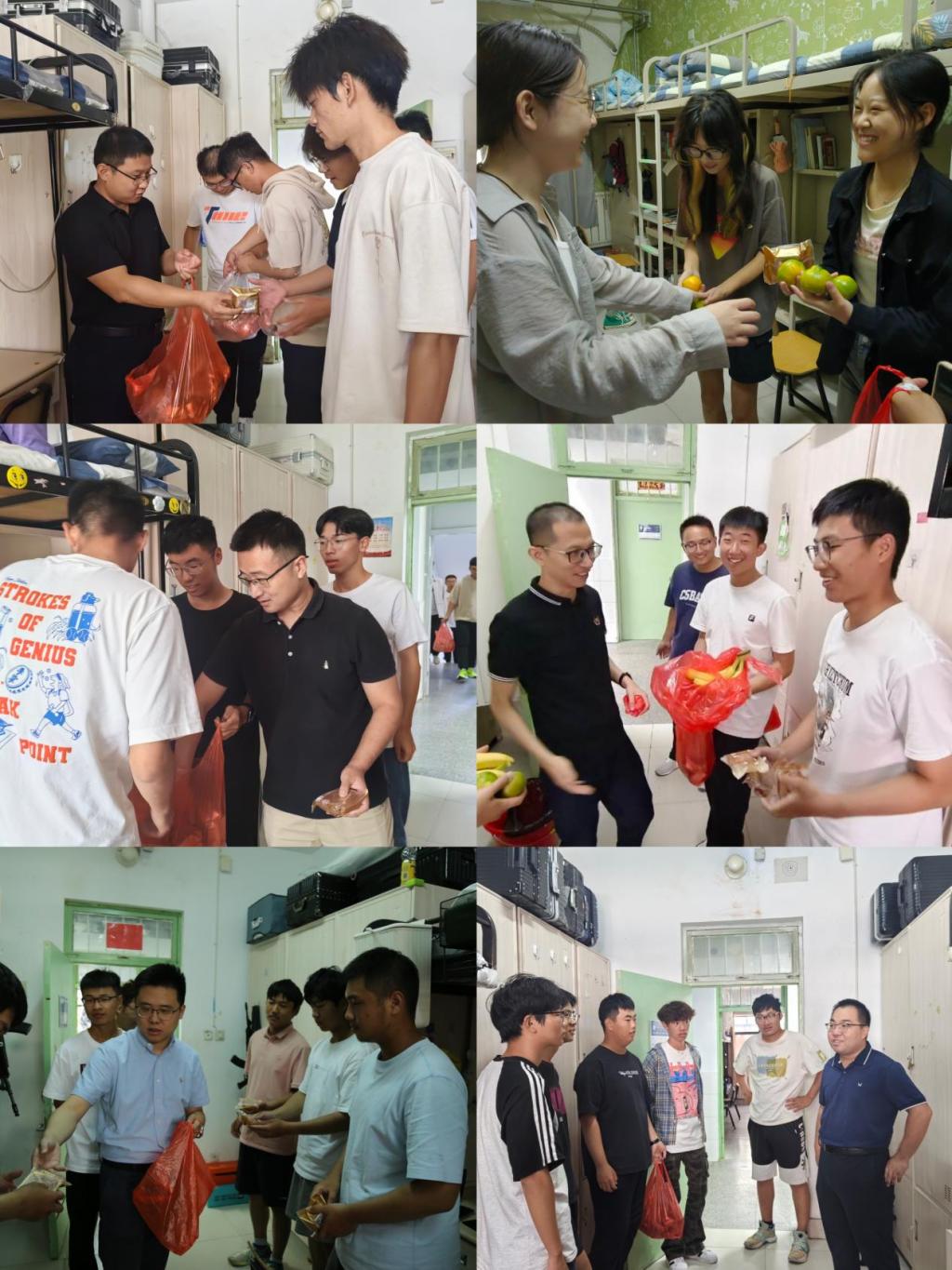 老师们细心询问了新生们的住宿情况、学习状态以及生活适应情况,用心关怀每位新生同学们的情绪和需求,同时提醒大家记得通过电话、视频等方式,与远在故乡的父母亲人们欢度佳节,共享团圆时刻。同时,老师们自发为新生准备了水果、饮料等慰问品,新生手捧月饼和礼物,脸上都洋溢着幸福的微笑,他们用一句句“谢谢老师”来表达内心的感动与喜悦。